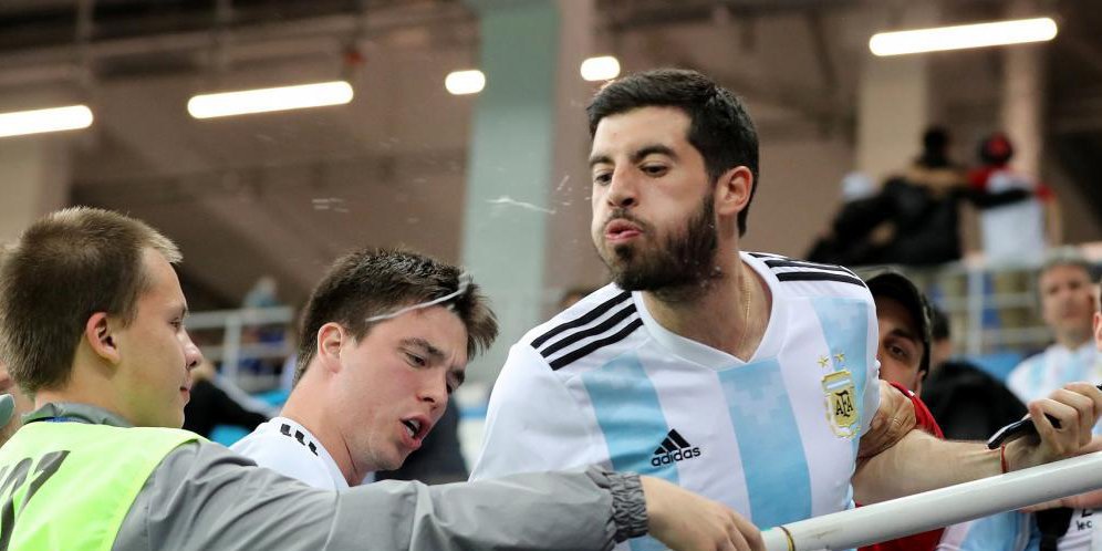 Tak puas hanya bersama menghina dan melempar botol ke arah sang pelatih, fans juga mengupayakan meludahi Sampaoli. Meski laju mereka ke arah bench Argentina sudah dihadang petugas, namun masih tersedia beberapa fans yang mencoba meludahi Sampaoli.